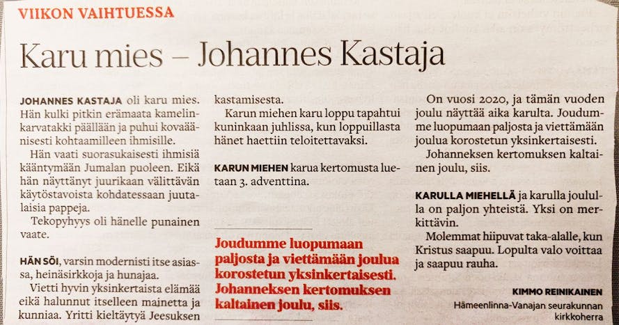 Kuvaus on tehty noin kuukausi sitten, mutta juuri tässä joulun alla ilmestyi kuvassa oleva juttu Johannes Kastajasta paikallislehteen. Lyhyestä jutusta löytyy yllättävä yhtymäkohta Sirpan tarinaan. Tästä syystä videon julkaiseminen siis venyi tänne jouluun saakka.