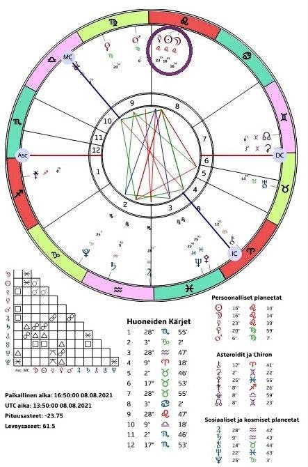 Sunnuntaina 8.8 klo 16:50 on Uusikuu 16 astetta leijonan tulimerkissä. Placidus huonejärjestelmällä Aurinko, Kuu ja Merkurius ovat kartan 8. eli skorpionin ja Pluton huoneessa. Perääntyvän Khironin kolmio Auringolle sekä Kuulle tuo uusiutuvaan aikaan eheyttävän lisänsä. Uranuksen neliö sitä vastoin lisää arvaamattomuutta sekä levottomuutta.