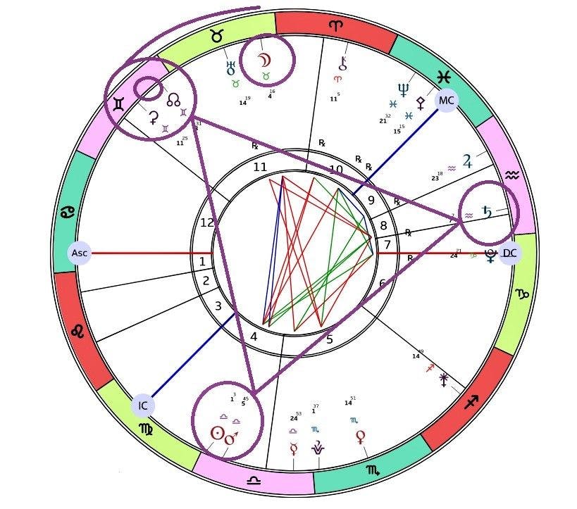 Sunnuntaina Aurinko on 3 ja Mars 7 astetta vaa`an merkissä. Perääntyvä Saturnus on 7 astetta vesimiehen merkissä. Kuunnoususolmu on 3, Lilith 7 ja Ceres 11 astetta kaksosten merkissä. Edellä olevien tekijöiden välille muodostuu kultainen ilmakolmio. Sunnuntain vaihtuessa maanantaille Kuu on 10 astetta kaksosten merkissä.