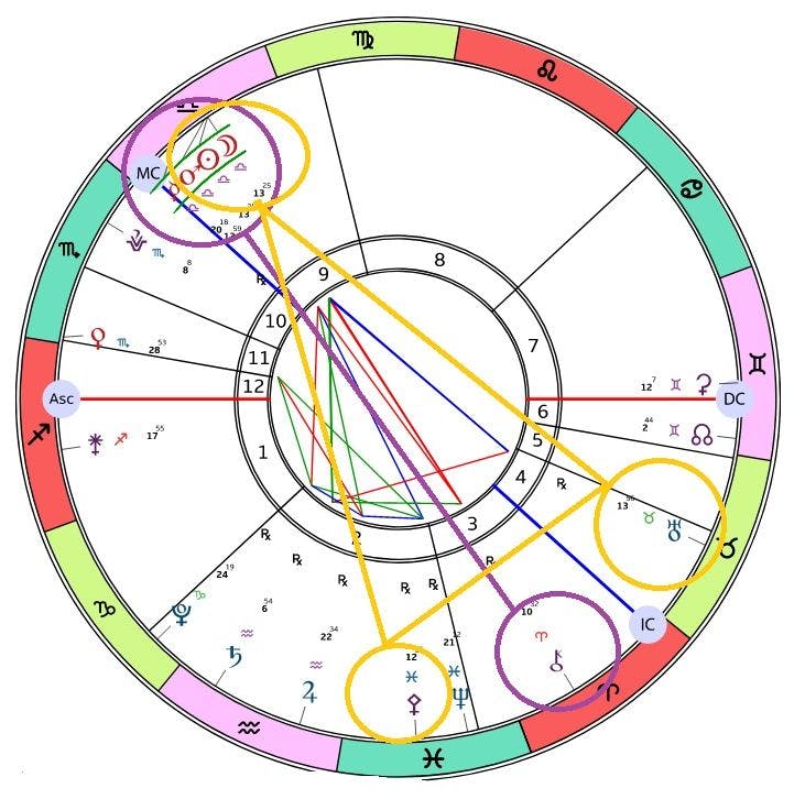 Uudenkuun kartalle muodostuu Jod eli Jumalan sormi suurkuvio. Uranus on 13 astetta härän merkissä ja Pallas 12 astetta kalojen merkissä, Auringon, Kuun ja Marsin ollessa Jodin kärkenä. Alitajuiset vaatimukset voivat ylikorostua. Toisilla se korostuu enemmän itseä kohtaan, kun taas toisilla muita ihmisiä kohtaan. Uudenkuun nouseva merkki on jousimies ja vastapäätä oleva laskeva merkki on kaksosissa. Laskeva merkki on 9, Ceres 12 ja Lilith 8 astetta kaksosissa. Kuunnoususolmu on 6. huoneessa muistuttamassa levon ja puhdistautumisen tarpeesta. Kukapa meistä ei aika ajoin kerryttäisi Kuun kulhoa liian täyteen, joten on hyvä pistää vedet virtaamaan. Siinä missä viikonloppu on levon aikaa, Uudenkuun ja tulevan viikon puoliväli on puhdistumisen sekä sisäisen vahvistumisen aikaa.