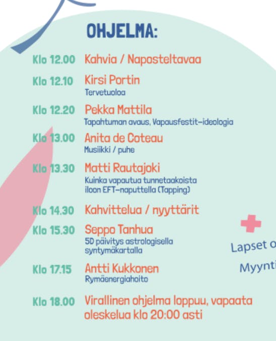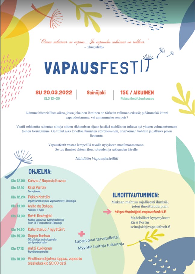 Vapausfestit 20.3.2022 Seinäjoella (Peräseinäjoki) osuvat perinteisesti yhteen vuoden juhlallisemmista hetkistä eli kevätpäivän tasaukseen. Festien tunnelmaa on turha lähteä sanoin kuvailemaan, sillä sen tietää vasta tullessaan paikalle. Tässä on alla kuvaus festien ohjelmasta ja selvyyden vuoksi linkki ilmoittautumiseen vielä erikseen tässä: https://seinäjoki.vapausfestit.fi