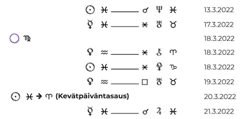 Aivan mahtava viikko on nyt käynnistymässä ja uudenlainen todellisuus syntymässä omaan henkilökohtaiseen elämään ja aivan varmasti myös yritysmaailmaan ja talouteen. Tällä viikolla Aurinko ja Merkurius aktivoivat huhtikuussa tarkaksi tulevaa Jupiterin ja Neptunuksen yhtymää kauniilla ja herkällä tavalla muiden kosmisten tekijöiden ohella. Myös Täysikuu tulee tukemaan tätä herkkyyden aikaa perjantaina 18.3. Myös maaginen kevätpäivän tasaus osuu tulevalle sunnuntaille, jolloin olen Seinäjoen maisemissa juttelemassa Astrologiasta ja 5D ulottuvuuksista itse kunkin astrologisella kartalla ja hiukan tutkaillaan myös Ukrainan tilannetta. Vapausfestien koko ohjelma löytyy tämän blogin lopusta. Osanottaja määrä on rajoitettu ja kannattaa ilmoittautua pikaisesti vaikka tästä: https://seinäjoki.vapausfestit.fi