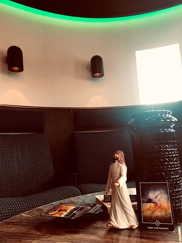 Antiikkikauppiaan musta bleiserini jäi roikkumaan henkariin, ja huomaan kuinka nautin siitä, että saan luoda nahkani ja rakentaa jäätävällä luovuudellani itseni uusiksi. Tulla moderniksi astrologiksi, joka pukeutuu kuin olisi astumassa elämän näyttämölle päätähtenä, taikka vetäytyä luostariin meditoimaan farkuissa ja flipflopeissa, rynnätä omalla tyylillä tilaisuuteen kuin tilaisuuteen, paikkaan kuin paikkaan. Koska osaan lukea kartaltani, ja tunnistan: tässä olen minä. Minut on