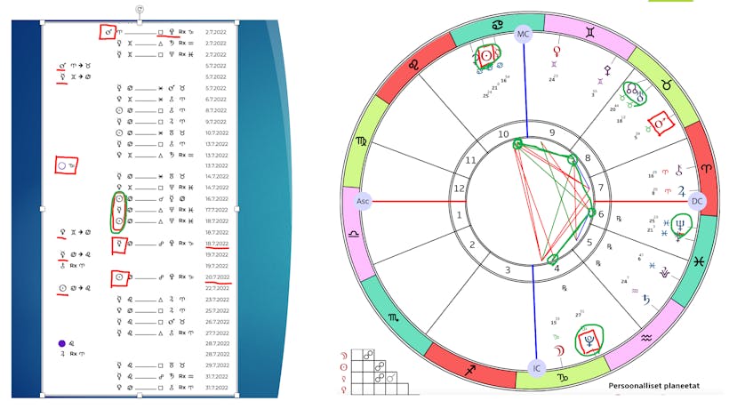 Kolikolla on kuitenkin myös toinen puoli, joka tuossa kuvassa näkyy vihreinä kehyksinä planeettain ympärillä. Taianomaista aina menneisiin elämiin asti ulottuvaa menestyksen ja onnistumisten flow-ilmiötä pääsevät aitiopaikalta todistamaan muutamat horoskooppimerkit ihan puhtaasti positiivisesta vinkkelistä. Jotkut taas pääsevät valitsemaan näiden kahden välillä, mutta ilman vahvaa omaa tahtoa ei kunnian kukko kenellekään laula.