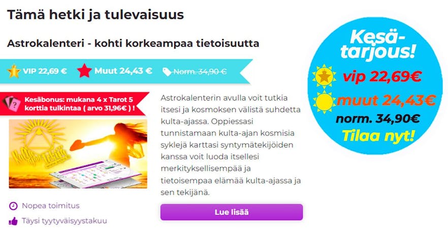 Ostaessasi nyt Astrokalenteri 12kk saat lisälahjana 4 x Tarot 5 tulkintaa. Lisälahjojen arvo on 31,96€.