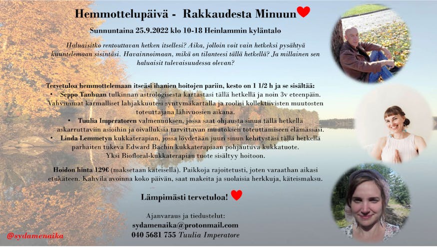 Ei se syy aina selviä, mutta minä selviän ja sehän on tietysti se tärkein pointti. Tällaisella asenteella toivottelen parasta mahdollista syyskuuta ja toivottelen tervetulleeksi Lahden Heinlammin kylätalolle kokonaisvaltaiseen hyvinvointipäivään 25.9.2022. Muualla en tee tulkintoja syyskuun aikana. Syy tähän eristäytymiseen selviää vielä tämän vuoden puolella. Jotain kivaa kaikille astrologian ystäville on joka tapauksessa tiedossa. Tässä vielä lopuksi mainos tuosta Lahden hyvinvointipäivästä.