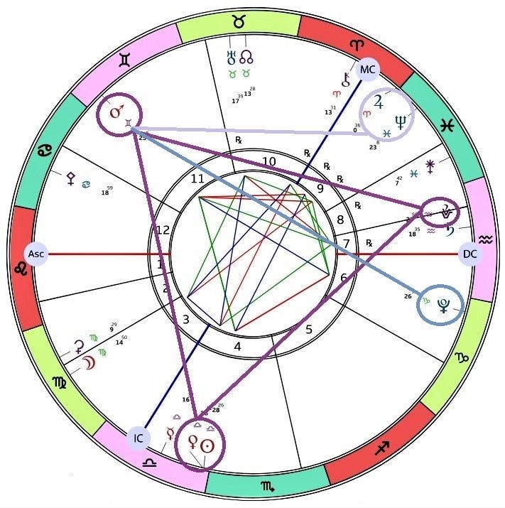 Merkurius on diplomaattinen ollessaan vaa`an merkissä. Pallaksen ja Lilithin neliöt lisäävät omat mausteensa soppaan. Pallas on viisas ja strateginen jumalatar, siinä missä Lilith on omassa voimassaan järkkymätön. Neliö on aktiivinen aspekti. Uudenkuun kartalla Merkuriuksen ja Pluton välille muodostuu myös neliö.