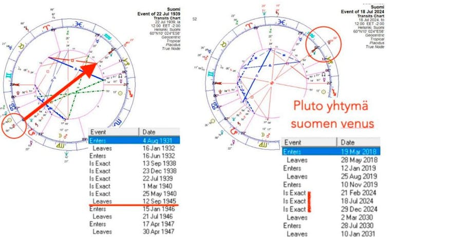 Pluto ohittaa Suomen venuksen 2024 eikä tätä ole aiemmin tapahtunut. Pluton ilmentäminen on planeetoista voimakkain eikä asiat sen jälkeen ole kuten ennen. Pluton myötä pinnallisuuteen, valtaan ja manipulointiin perustuneet arvot tulevat paljastumaan. On valinnan paikka annetaanko sen jatkua ja edelleen kehittyä vai valitaanko aitoja ja ihmisyyttä palvelevia syvällisiä ja kestäviä arvoja. Tyypillisesti sitä toista mahdollisuutta ohjataan täysin kylmillä rahan ja vallan arvoilla. Tätä on pluton ohittaessa Suomen Venuksen. Vaikutusaika voidaan katsoa alkaneeksi viimeistään loppuvuodesta 2019 ja jatkuvan 2030 saakka.