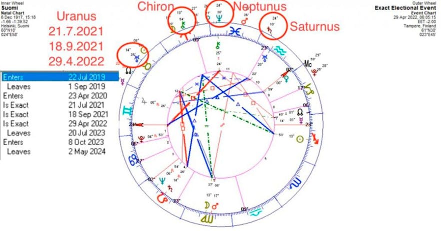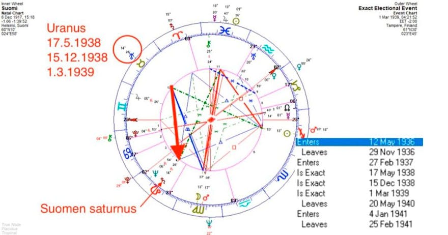 Uranuksen vaikutus Suomen astrologisella kartalla kohdistuu useampaan kohtaan. Samanlainen tilanne oli viimeksi suunnilleen 1937 – 40.