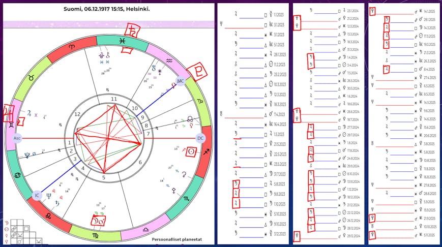 Kovin rehvakkaasti ei missään tapauksessa pitäisi lähteä ketään naapuria uhittelemaan tällaisten kuvioiden aikana. 2024 listauksessa olen merkinnyt punaisilla laatikoilla Pluton yhtymät, jotka hallitsevat Suomen karttaa kahden vuoden ajan. Mitä elämän ja kuoleman planeetta tulee tarjoilemaan Suomi neitomme asemalle maailmankartalla? Enpä tosiaan halua yhtään ennustaa, vaikka kuluneen vuoden ratkaisut siihen kovasti houkuttelevat.