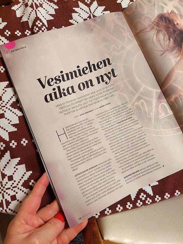 Minua haastateltiin syksyllä Vesimiehen aikaa koskevaan lehtijuttuun. Koska aihe oli perinjuurin kiinnostava, suostuin heti. Hetken päästä mietin, että miksi juuri minua pyydettiin tähän, enhän ole mitenkään aiheen asiantuntija. Kunnes tajusin, että oikeastaan olen. Karttani Mars, Merkurius ja Aurinko Vesimiehessä takaavat sen, että edustan Vesimiehen ajan ydinarvoja. Ajattelen ja toimin kuin Vesimies, uuden ajan ihminen. Yhtäkään planeettaa minulla ei ole Kaloissa. En siis oikein kuulu Kalojen aikaan, josta olemme juuri kiskaisemassa toista jalkaamme pois.