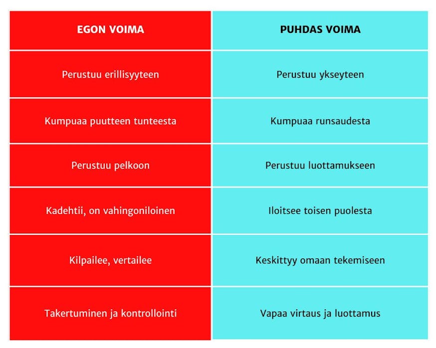 Olen koonnut alla olevaan taulukkoon muutamia puhtaan voiman ja egon voiman tunnusmerkkejä, jotta voisit helpommin erottaa nämä kaksi toisistaan. Kannattaakin rehellisesti välillä kysyä itseltään: millä voimalla minä toimin tässä? Onko voimani puhdas vai onko ego sotkeutunut siihen?