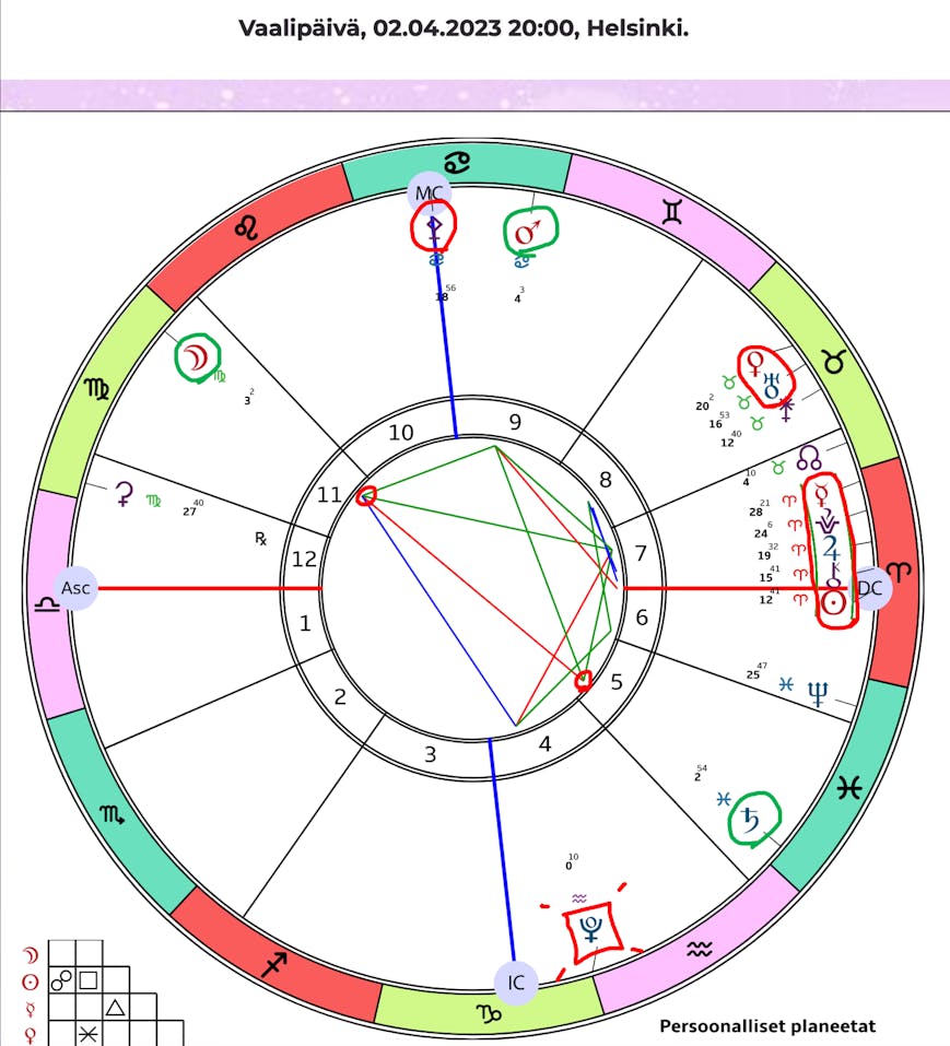 Ensimmäiseksi kiinnittyy huomio vankkaan stelliumiin Oinaan merkissä kartan laskevalla merkillä. Tarkimpana on Auringon ja Chironin tarkka yhtymä, joka symbolisesti kuvaa parantavaa ja samalla viisasta latausta hetkelle, jolloin uurnat sulkeutuvat. Jupiter samassa kuviossa kuvaa laajentuvaa tietoisuutta ehkä jollain hyvinkin yllättävällä tavalla. Äänestyskäyttäytyminen saattaa yllättää äänestäjien spontaanilla reagoinnilla esillä oleviin vaihtoehtoihin. Mielipidekyselyt saattavat heittää pahemman kerran, eikä ennakkoon kaavailuille hallituskuvioille löydykään toteutumismahdollisuuksia. Shamanistinen Auringon ja Chironin yhtymä voi hyvinkin merkitä suomalaisuuden yllättävää esiinmarssia ohi aikaisempien puoluerajojen. Henkisillä arvoilla tulee olemaan seuraavalla hallituskaudella tavallista suurempi merkitys. Uskoisin näin impulsiivisen Oinasenergian tuovan äänestyspaikoille tavallista enemmän aktiivisia äänestäjiä, joka sekin lisää yllätysmomentin määrää.
