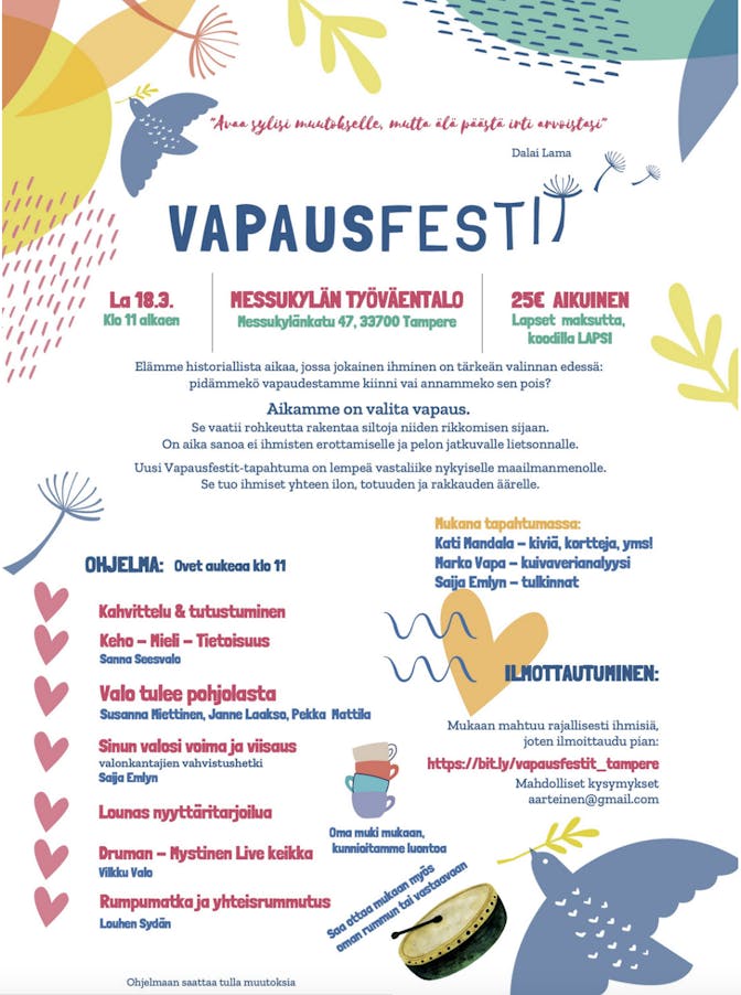 Viestini toimii myös "kutsuna Tampereen Vapausfesteille la 18.3. klo 11-20", jossa teemme merkittävän julkistuksen siitä, mitä tärkeää Suomessa alkaa tapahtua uuden ohjauksen saattelemana Mukaan pääset tästä
