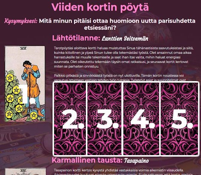 Tarot 5 korttia pöydän avulla voit katsoa vastauksia esimerkiksi ihmissuhteisiin, rakkauteen, työhön, rahaan ja asumiseen liittyviin asioihin. Pöydän tekeminen on ILMAISTA. Voit siis katsoa korttisi. Pöydän tulkinnasta veloitan pelipoleteilla 5€ / pöytä (norm. 7,99€).
