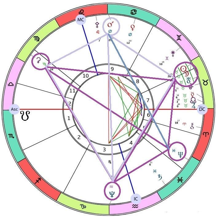 Kuvateksti; Toinen leija on piirretty violetilla ja toinen lilalla. Marsin ja Neptunuksen kolmio on merkitty siniharmaalla viivalla. Näistä muodostuu kirjekuori niminen suurkuvio.