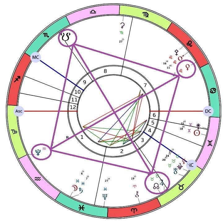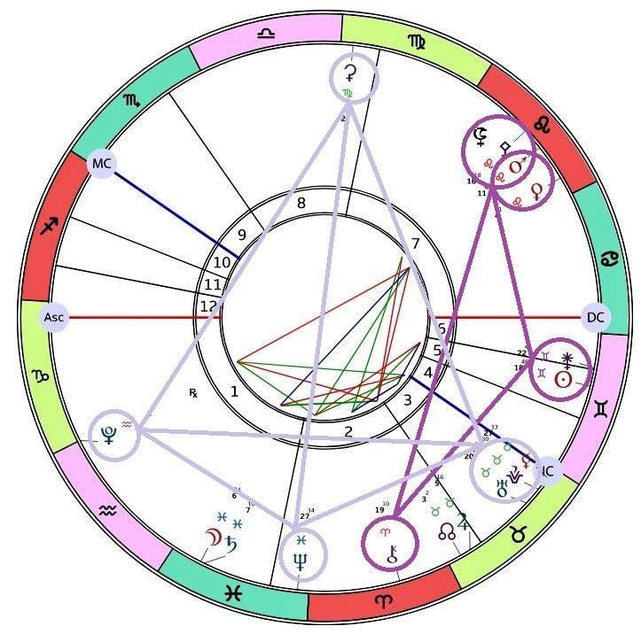 Aurinko ja Juno ovat konjunktiossa kaksosten merkissä sekä sekstiilissä Pallas Atheneen, Lilithiin sekä Marsiin, että toisella puolella olevaan Khironiin. Vaikka Venus ja Mars ovat konjunktiossa leijonan merkissä, Venus on silti sen verran etäämmällä, ettei se ole mukana edellä mainituissa kuvioissa.