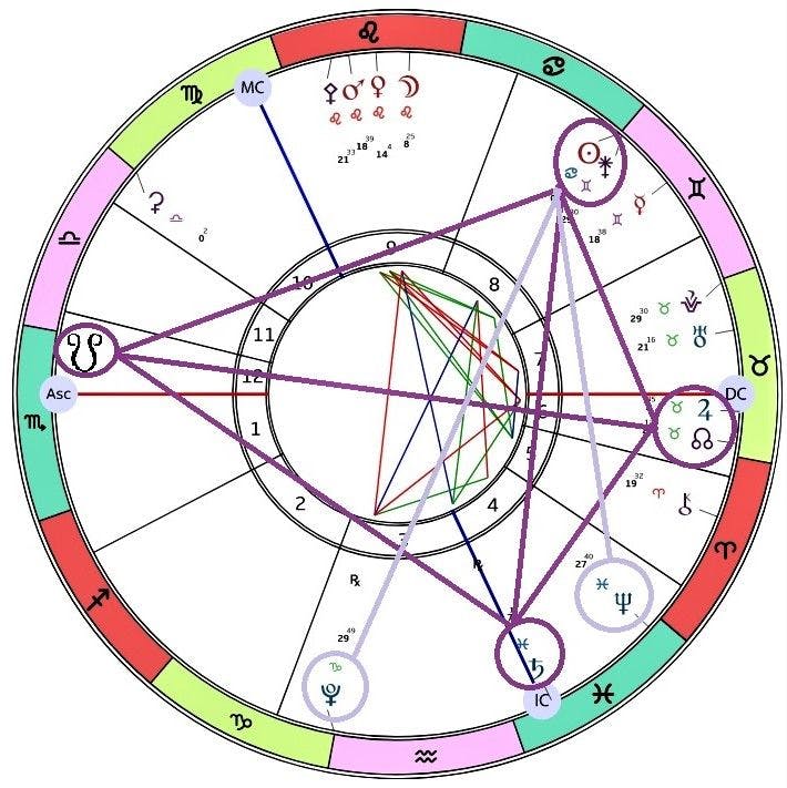 Cereksen, Pluton ja Vestan välisistä kolmioista muodostuu kultainen kolmio suurkuvio, jonka Neptunus täydentää leijaksi.