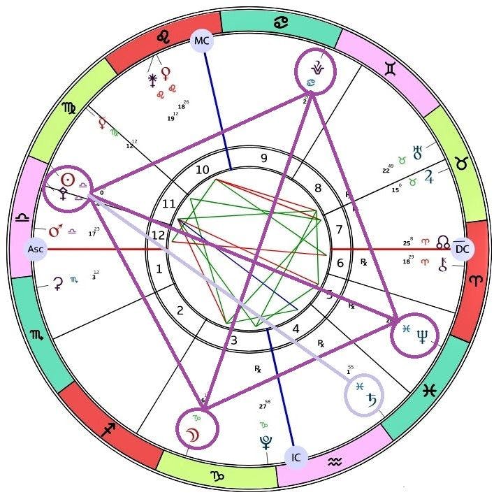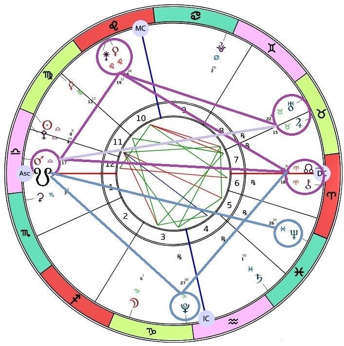 Venuksen ja Junon neliöt perääntyvälle Jupiterille sekä perääntyvälle Uranukselle tuo mukanaan levottomuutta. Venuksen ja Junon kolmio perääntyvälle Khironille sitä vastoin eheyttää ja tukee syvempää ymmärryksen tasoa arvomaailmaan ja ihmissuhteisiin liittyvissä asioissa. Vaikka kaikkia haavoja ei voi kerrasta parantaa, Khironin viisaus avaa näkökantoja, jotka voivat muuttaa näkemyksiä.