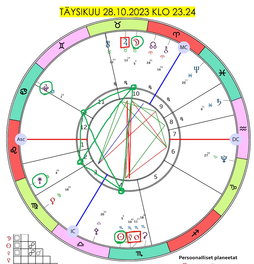 Jos viime viikko oli hurjien ja jopa sotaisten energioiden ristitulta, niin nyt alkaa täysin toisenlainen tarunhohtoiseen valon ja rakkauden täysikuuhun lauantaina 28.10.2023 klo 23.23 huipentuva viikko. Auringon ja Kuun välille rakentuu Vestan (Pyhä tuli) ja Junon (kaksoisliekit) muodostama kauniin harmoninen ja asteiltaan tarkka kehtokuvio, jonka oppositio akselilta löytyy lisäksi Marsin ja Merkuriuksen oppositio Jupiterille.