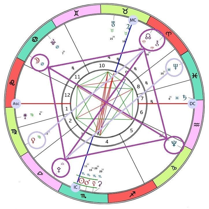 Venuksen, Pluton ja Uranuksen välinen kolmio vakauttaa, vahvistaa sekä tukee arvomaailmaan ja omaan elämään liittyvissä asioissa. Venuksen ja Neptunuksen oppositio on taas sumentava ja lamaannuttava tekijä, joka saattaa viedä huomion väärille poluille. Jos välillä hairahtaa liikaa melankolian puolelle on hyvä muistaa, että sekin voi olla osa puhdistusreaktiota. Asiat, jotka nousevat pintaan kertovat arvokasta sanomaansa.