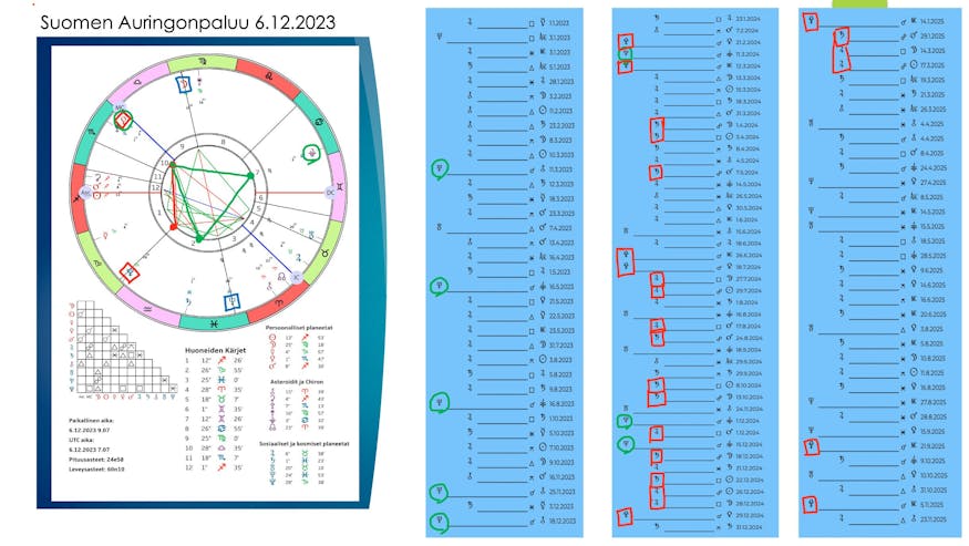 Suomen syntymähetken mukaan laadittu astrologinen Auringonpaluukartta itsenäisyyspäivästä alkavalle seuraavalle vuodelle (kuvassa vasemmalla) antaa ymmärtää, että kyllä sitä onnea nyt todellakin tarvitaan. Aivan uskomattomalla tarkkuudella kartan Venus on samalla tavalla yhtymässä Keskitaivaan akselille, kuin Suomen syntymäkartalla. Toinen ja ehdottomasti painavampi juttu on Auringonpaluukartan Pluto, joka on tarkassa neliössä Keskitaivaaseen ja Venukseen. Nämä kuviot kertovat suorastaan hurjasta muutosvaiheesta Suomen roolissa ehkä koko maailmanhistorian näkökulmasta katseltuna. Elämän ja kuoleman planeetta Pluto opastaa Suomen ja suomalaiset omaksumaan kokonaan uudenlaisen, kosmista tarkoitusta vastaavan arvomaailman.