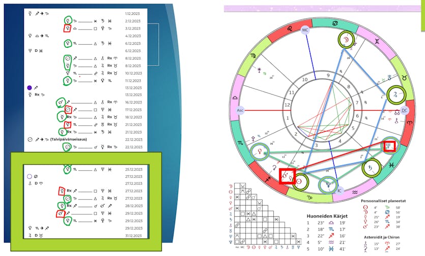 Sitä ennen ja etenkin tätä viestiä lukiessasi voit keskittyä yhteen ainoaan asiaan, eli tekemään omasta joulustasi niin valoisan, rauhallisen ja onnellisen, kuin suinkin mahdollista. Näin herkän jakson aikana ei ole mitään syytä haaskata aikaa minkäänlaiseen puurtamiseen, eikä etenkään mihinkään ahdistavaan velvollisuuksien täyttämiseen. Tuolta joulunajan kartalta on löydettävissä punaisilla neliöillä merkittynä Marsin perääntyvän Merkuriuksen neliö Neptunukselle, joka korostaa aivan tolkuttoman ankaralla tavalla intuition merkitystä kaikessa tekemisessä ennen vuodenvaihdetta. Viisainta on heittäytyä mahdollisimman leijuvaan tilaan, kuten itsekin aion tehdä heti tämän artikkelin valmistuttua hyvissä ajoin ennen pyhiä.