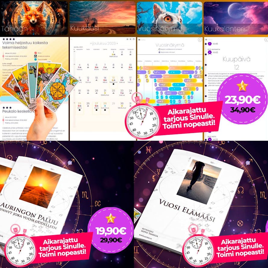 Huomio: Astrossa on Uuden Vuoden hintahuipentuma astrologisissa tulkinnoissa 4.1.2024 asti. Käy katsomassa tarjoukset läpi ja etsi mikä tulkinnoista resonoi juuri tähän hetkeen parhaiten sinulle. Kaikista parhaimmat tarjoukset löytyvät kuitenkin 3:sta aikaa tutkivasta tulkinnasta. Käy katsomassa mitä nuo tulkinnat ovat ja millaisia lisälahjoja on tarjolla. Valmistaudu hyvin vuoteen 2024. Siirry tarjousten pariin tästä