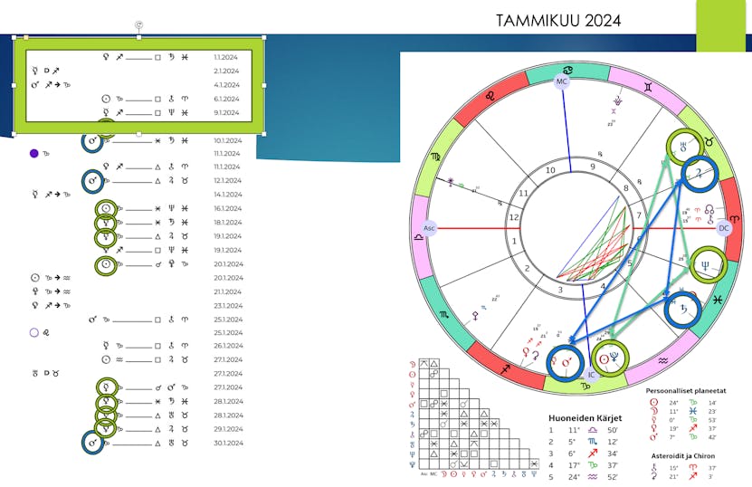 "Tammikuun kartalla näkyy 10.1. alkaen kaksi upeaa pikkukolmiota. Ensimmäisessä vihreällä merkityssä Aurinko ja Pluto tekevät sekstiiliä Neptunukselle ja kolmiota Uranukselle. Tämä tuo tullessaan voimakasta ja samalla tasapainoista latausta kaikkeen luovaan tekemiseen elämässäsi. Parhaiten tietysti luistavat sellaiset asiat, jotka ovat muutenkin lähellä sydäntäsi. Intuitio ja kekseliäisyys kutsuvat tekemään nopeita ja oivaltavia ratkaisuja ihan vaan fiiliksellä.