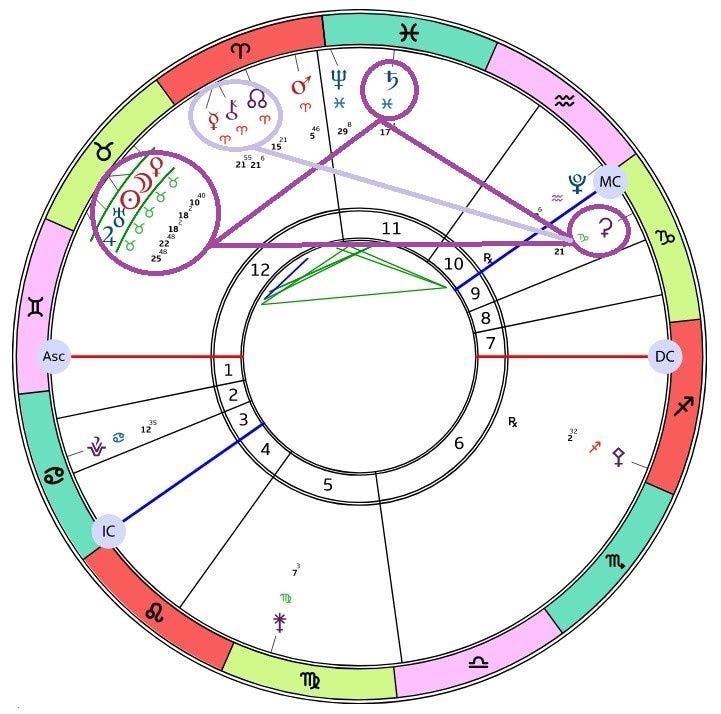Perääntyvän Pluton sekstiili perääntyvälle Pallakselle sekä Neptunuksen ja Marsin konjunktiolle saa aikaan pikkukolmio aspektikuvion, joka lataa Marsin energian täyteen potentiaaliin. Vaikka Mars on oinaan alkukantaisessa tulimerkissä, Neptunus herkistää sen luonnetta ja auttaa löytämään oikeanlaisen herkkyyden tekemiseen.