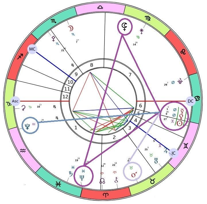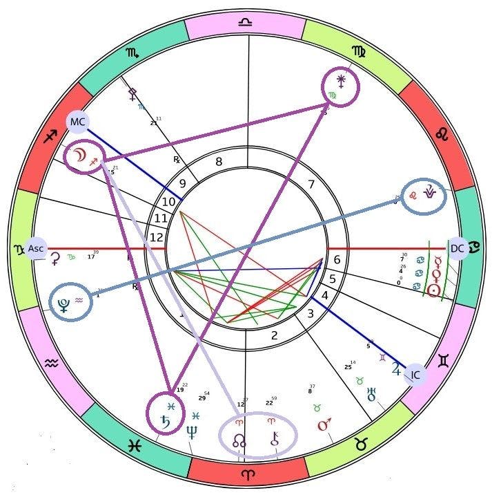 Kesäpäivänseisauksen kartalla on Kuun neliöt Saturnukselle sekä Junolle. Tästä muodostuu T-risti kuvio. Kuu on jousimiehen tulimerkissä, joten luonteeltaan se voi olla levoton ja liiallisuuksiin menevä. Saturnuksen mukana olo rauhoittaa ja maadoittaa sitä, vaikkakin paikoin se voi tuntua ärsykkeeltä. Juno on edustaa avioliittoa, kumppanuutta, sitoutumista ja niitä haasteita ja voimavaroja, jotka liittyvät pitkäaikaisiin ihmissuhteisiin. Juno nimettiin roomalaisen jumalattaren mukaan, joka oli Jupiterin puoliso ja avioliiton suojelija. Juno voi paljastaa, miten ihmiset tasapainottavat roolit suhteissaan ja miten he käsittelevät vallan ja vastuun jakamista. Junon haasteellisissa aspekteissa saatamme kohdata hylätyksi tulemisen pelkoa ja turvattomuutta. Junon tarkastelu auttaa ymmärtämään yksilön henkilökohtaisia tarpeita ja odotuksia suhteissa, mikä voi auttaa luomaan terveempiä ja tasapainoisempia ihmissuhteita. Kuun kolmiot Kuunnoususolmulle ja Khironille auttaa näkemään mitkä vaihtoehdot ovat elinvoimaisimpia ja missä on mukana parantavaa eliksiiriä. Tämä voi olla energisoiva ja puhdistava kuvio.