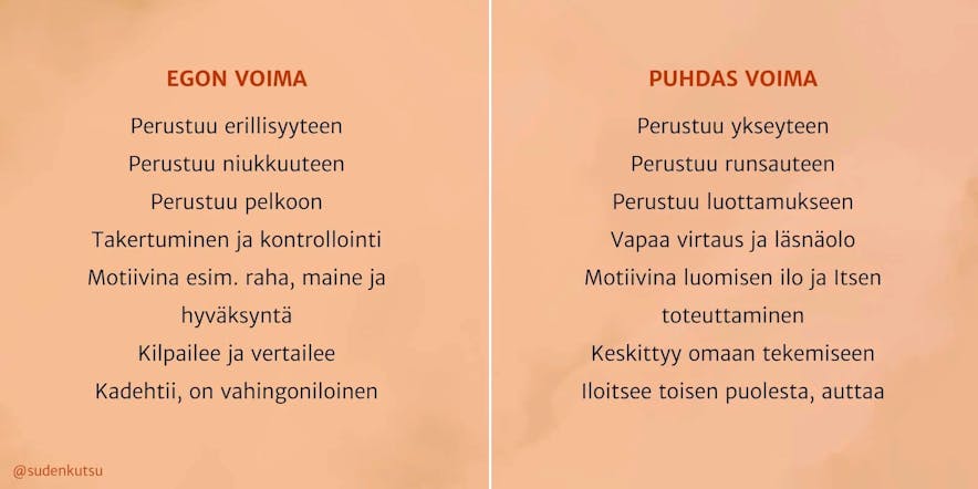Egon voima perustuu erillisyyteen, niukkuuteen, persoonaan ja sitä kautta vertailuun sekä kilpailuun. Puhdas voima taas perustuu ykseyteen, runsauteen, tyhjyyteen ja johtaa yhteistyöhön sekä auttamiseen.