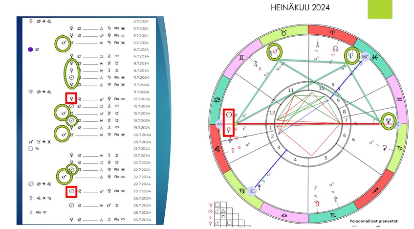 Suorastaan posketon kuukauden kestävä positiivisen energian tsunami käynnistyy heti heinäkuun ensimmäisellä viikolla Marsin aloittaessa kosmisten planeettojen aktivoimisen tekemällä pienenä alkulämmittelynä sekstiilin Saturnukselle. Persoonalliset tekijät Merkurius, Venus ja Aurinko ovat nekin kuviossa mukana kuun alusta lukien. Näin valtava energiapurkaus toimii silti kahtiajakoisesti, koska kehtokuviota purkavana rajapintana näyttää olevan näiden samojen tekijöiden oppositio Plutolle.