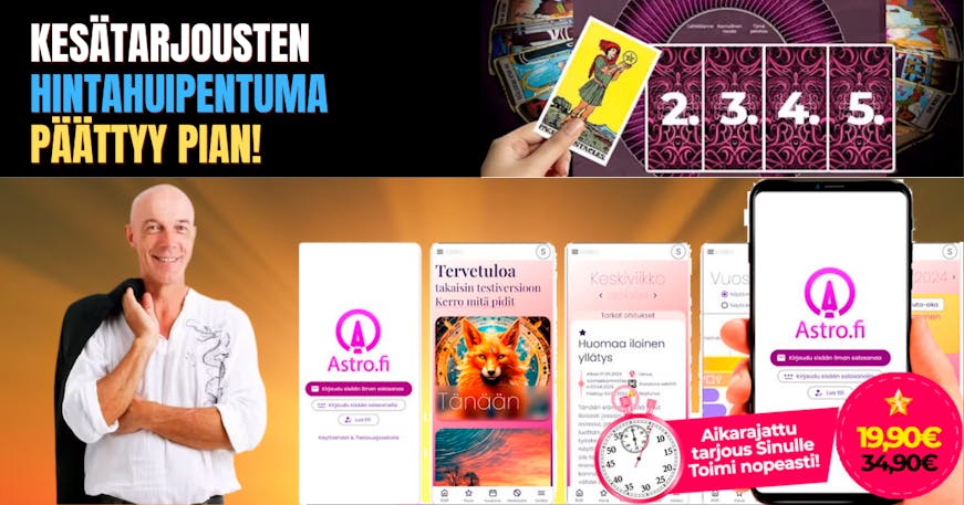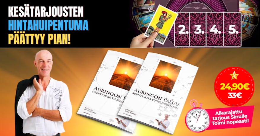 HUOMIO: Tarjoukset koskevat kaikkia asiakkaita riippumatta siitä onko vip asiakas vai ei. Paljon astrologisia tulkintoja, verkkokursseja sekä muita tuotteita huippuedullisesti rajoitetun ajan (tulkintoja alkaen 11,5€). Useissa tuotteissa mukana Tarot lisälahja (lisälahja arvo 16 - 32€) ! Tarjoukset voimassa vain 31.7.2024 klo 24 saakka. Siirry tutkimaan kesäalen tuotteita tästä