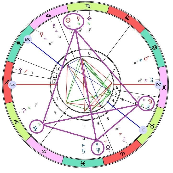 Venuksen kvinkunssit Kuulle ja Uranukselle sekä Neptunukselle muodostavat Jod suurkuvion. Kvinkunssi tuo usein esiin ristiriitaisia energioita, jotka eivät kohtaa helposti, mutta voivat tarjota kasvumahdollisuuksia, jos ne käsitellään oikein. Kun Kuu, Uranus ja Neptunus muodostavat kvinkunssin Venukseen, nämä teemat näkyvät erityisesti ihmissuhteissa, tunteissa, arvoissa ja rakkaudessa. Kuu liittyy tunteisiin, turvallisuuteen ja kotiin, kun taas Venus hallitsee rakkautta, arvomaailmaa ja ihmissuhteita. Kvinkunssi näiden välillä voi luoda ristiriitaa tunne-elämän ja ihmissuhteiden tarpeiden välillä. Uranus edustaa odottamattomia muutoksia, itsenäisyyttä ja vapautta. Kvinkunssi Venukseen tuo jännitteitä rakkaudessa ja suhteissa, koska Venuksen harmonia ja Uranuksen arvaamattomuus eivät aina sovi yhteen. Tämä aspekti voi tehdä ihmissuhteista epävakaita, koska Uranuksen vaikutus Venukseen tuo tarvetta vapaudelle ja itsenäisyydelle. Tunteet voivat olla nopeasti muuttuvia, ja suhteissa voi olla vaikea sitoutua. Neptunus hallitsee unelmia, illuusioita ja henkisyyttä. Kvinkunssi Venukseen voi aiheuttaa sekaannusta ja epärealistisia odotuksia rakkaudessa ja arvoissa. Tämä aspekti voi myös tehdä suhteiden rajoista epäselviä. On mahdollista, että romanttisissa suhteissa voi tulla vastaan itsensä unohtamista tai epäselvyyttä toiveiden ja todellisuuden välillä.