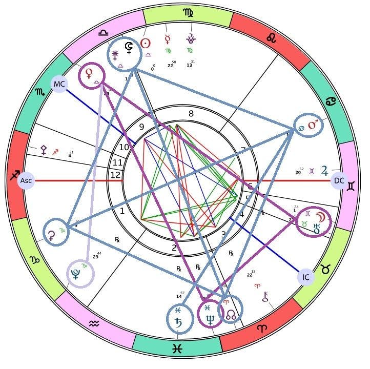 Mars on ravun merkissä ja oppositiossa Cerekseen. Marsin ja Cereksen oppositio tuo yhteen kaksi hyvin erilaista energiaa, mikä voi aiheuttaa ristiriitoja. Tämä oppositio voi osoittaa haastetta löytää tasapaino hoivan, ravitsemisen ja pehmeiden, vastaanottavien energioiden sekä Marsin edustaman aggressiivisen, aktiivisen energian välillä. Tämä voi johtaa vastakkainasetteluun hoivan ja vapauden tarpeiden välillä. Kuvio haastaa löytämään tasapainon huolenpidon ja toiminnan, hoivan ja vapauden, sekä tunteiden ja fyysisen energian välillä. Marsin neliöt Kuunsolmuille sekä Kuunalasolmulla olevalle Junolle ja Lilithille voi aiheuttaa voimakkaita energiapurkauksia ja aktivoida ihmissuhteissa olevat teemat varsin näkyviksi. Marsin ja perääntyvän Saturnuksen kolmio on sitä vastoin periksiantamaton ja kestävä kuvio, joka menee määrätietoisesti eteenpäin. Ajassa on paljon mahdollisuuksia rikkoa vanhoja kaavoja sekä kierteitä sekä tehdä niistä konkreettisia uusia polkuja.