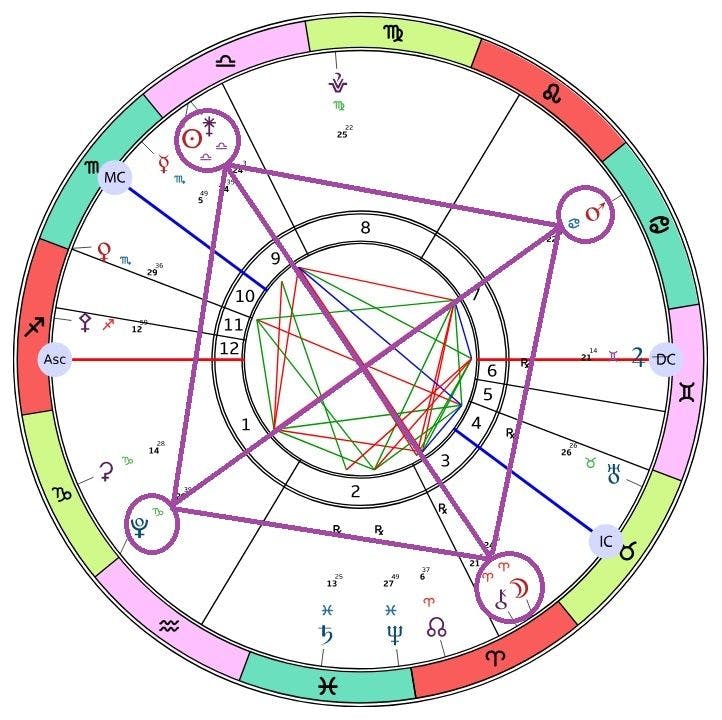 Suuriristi kuvio tuo mukanaan vahvan dynaamisen jännitteen ja symboloi usein suuria haasteita ja mahdollisuuksia kasvuun. Koska Suuriristi muodostuu useista neliöistä ja oppositioista, se symboloi jännitteiden dynamiikkaa. Neliöt ja oppositiot edustavat energioita, jotka ovat usein ristiriidassa keskenään ja voivat aiheuttaa stressiä, konfliktia ja vaikeuksia. Suuriristi kertoo siitä, että elämässä voi olla monia vastakkaisia voimia, jotka vaativat huomiota. Se voi tuntua raskaalta, mutta haasteet voivat toimia myös kasvun ja kehityksen katalysaattoreina, jos ne käsitellään viisaasti. Suuriristi edustaa myös energian virtausta, joka pakottaa liikkeeseen. Paine ja jännitteet eivät anna pysyä passiivisena, vaan vaativat ratkaisuja ja päätöksiä. Tämä voi johtaa merkittävään kasvuun ja saavutuksiin, jos pystyy hallitsemaan tilanteen ja löytämään tavan kanavoida jännitteen rakentavalla tavalla. Suuriristi tuo monimutkaisuutta elämään, sillä useat eri elämän osa-alueet voivat vaatia huomiota samanaikaisesti. Johtavien merkkien Suuriristi (oinas, rapu, vaaka, kauris) liittyy aloittamiseen ja toimintaan. Se symboloi tarvetta tehdä päätöksiä ja edetä eteenpäin, mutta voi aiheuttaa kiirehtimistä ja impulsiivisuutta. Suuriristi symboloi astrologiassa intensiivisyyttä ja ristiriitaa, mutta samalla se tarjoaa mahdollisuuden merkittävään henkilökohtaiseen kasvuun ja kehitykseen. Se on kuvio, joka pakottaa kohtaamaan vaikeuksia ja löytämään uusia ratkaisuja, mikä voi johtaa vahvempaan itsensä ymmärtämiseen ja elämän hallintaan. Jotta voimme antautua ajassa oleville mahdollisuuksille, on tärkeä levätä ja ottaa mahdollisimman rennosti. Auringon ja Jupiterin välinen kolmio on onnenkantamoinen, jonka avulla voimme vahvistaa voimavarojamme sekä laajentaa perspektiiviä asioissa, joihin kohdistamme voimamme.
