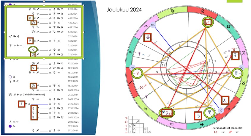 Onneksi tilannetta tasapainottaa Kosmisten planeettojen rakentama kirjekuori kuvio, joka puolestaan tarjoaa onnen ja menestyksen hetkiä kaikessa pakottomassa ja intuitioon perustuvassa tekemisessä. Tämän kuvion osumat omalle kartalle kertovat puolestaan siitä suunnasta, jolle kosmoksen tuulet antavat mukavasti lisää vauhtia.