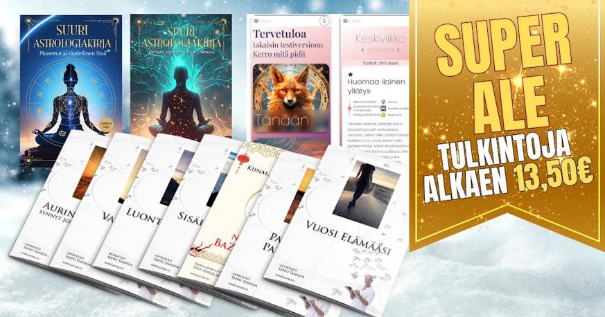 Fyysisen terveytemme tärkein perusta on aivan varmasti henkinen hyvinvointi ja viimeisten 35 vuoden aikana olen tullut koko ajan vakuuttuneemmaksi siitä, että omien värähtelyjen seuraaminen astrologisten tekijöiden opastuksella on loistava keino päästä omalle aidoimmalle aaltopituudelle. Piipahda ihmeessä astrokaupassa katsomassa, mikä siellä tuntuisi värähtelevän voimakkaimmin juuri tällä hetkellä. Tarjolla on laaja valikoima tuotteita (26 tuotetta), jotka inspiroivat ja ohjaavat syvemmälle itsesi ja ympäröivän maailman ymmärtämiseen. Nyt on aika tarttua tilaisuuteen. Alennukset ovat voimassa vain rajoitetun ajan 27.12.2024 saakka!