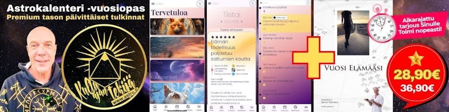 Astrologi Seppo Tanhuan kehittämä Astrokalenteri tarjoaa tarkat, juuri sinun omaan karttasi perustuvat päivittäiset ja kuukausittaiset astrologiset tulkinnat joiden avulla tiedät, milloin on otollinen aika edistää ihmissuhteita, panostaa uraan tai löytää omaa hyvinvointiasi tukevat hetket. Näin pystyt hyödyntämään vuoden jokaisen päivän energiat täysillä – tekemään elämästäsi tarkoituksellisempaa ja suunnitelmallisempaa. Katso opasvideo.