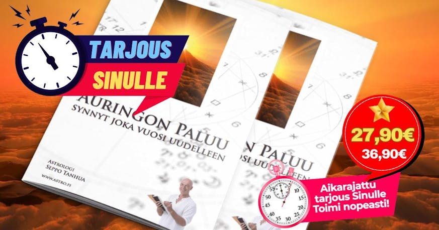 Auringon Paluu tulkinta toimii avaimena nykyiseen ja tulevaan aurinkovuoteesi. Se auttaa sinua hyödyntämään tämän hetken ja tulevan vuoden kosmiset energiat parhaalla mahdollisella tavalla. Tilauksessa saat nyt menossa olevan vuoden tulkinnan ja seuraavasta syntymäpäivästäsi käynnistyvän tulkinnan vuodeksi eteenpäin. Tilaa henkilökohtainen Auringonpaluukarttasi tänään. Tämä on täydellinen tilaisuus saada yksityiskohtainen käsitys siitä, mitä tulevaisuus pitää Sinulle varattuna.
