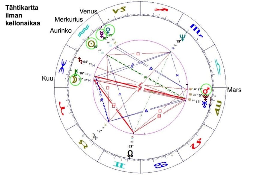 Tähtikartassa on nyt viisi kpl henkilökohtaisia tekijöitä. Tulkittavaa on siis jonkin verran vähemmän ilman tarkkaa syntymähetken kellonaikaa. Kartta on muuten sama kuin edellinenkin. Tulkinnassa tarkastellaan henkilökohtaisten tekijöiden aspekteja toisiinsa ja muihin tähtikartan tekijöihin.