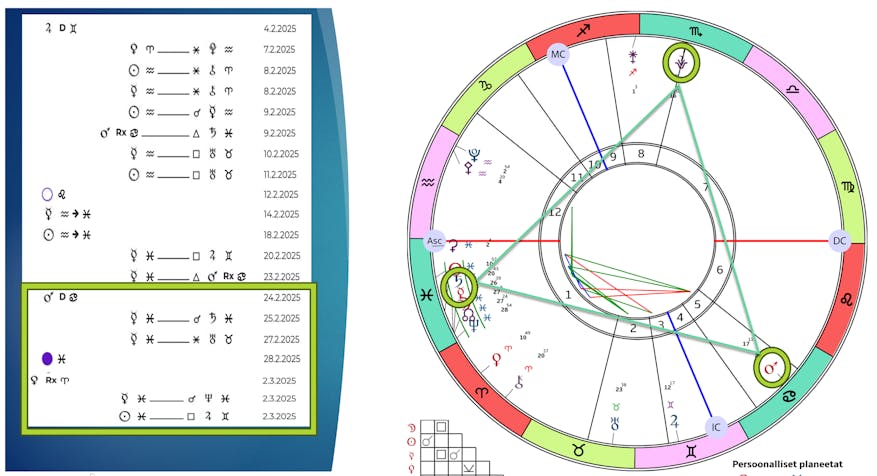 Nyt alkaneena aurinkovuotena Suomen astrologisella kartalla näkyy merkittäviä muutoksia, kuten Jupiterin ja Saturnuksen välinen neliö, joka muodostaa suuren ristin Kuun, Marsin ja Auringon kanssa, sekä Pluton yhtymä Suomen kartan keskitaivaalle, nämä energiat eivät vaikuta vain maamme suureen kuvaan, vaan myös meihin yksilöinä. Juuri tällaisina aikoina on tärkeämpää kuin koskaan tietää, miten nämä voimakkaat energiat koskettavat omaa elämääsi. Oma auringonpaluu tulkintasi antaa sinulle selkeän näkemyksen siitä, miten voit kulkea tulevaan vuoteen tietoisemmin, luottaen omiin mahdollisuuksiisi ja vahvuuksiisi.