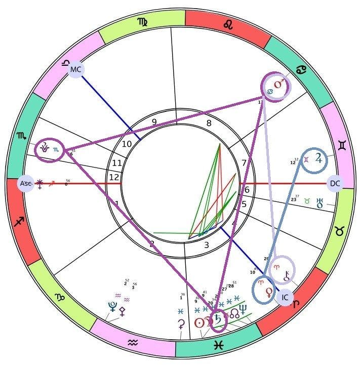 Marsin, Saturnuksen ja Vestan välinen vesimerkkien suurkolmio tuo emotionaalista sinnikkyyttä, omistautumista ja syvää henkistä voimaa. Mars tuo toimintaa, Saturnus pitkäjänteisyyttä ja Vesta omistautumista. Tämä on vahvaa sisäistä energiaa, joka auttaa sinua keskittymään tavoitteisiisi syvällä sitoutumisella. Saturnuksen vaikutus tasapainottaa Marsin impulsiivisuutta, mikä auttaa tekemään pitkäjänteisiä ja viisaita päätöksiä tunteiden pohjalta. Vesta edustaa pyhää tulta ja omistautumista, ja vesimerkeissä se voi tarkoittaa henkistä kasvua, syvää tunne-elämän parantumista ja jopa intuitiivista ohjausta. Tämä on otollinen aika emotionaaliselle paranemiselle, terapeuttiselle työskentelylle tai hengelliselle syventymiselle. Tämä on hyvä hetki aloittaa projekti, joka vaatii kestävyyttä ja tunnesitoutumista. Meditaatio, energiahoidot, varjotyö tai itsereflektointi voivat tuoda suuria oivalluksia. Vestan mukanaolo viittaa siihen, että tämä energia kannattaa suunnata johonkin, mitä todella arvostat ja mikä tuntuu pyhältä. Tämä on erinomainen transiitti itsensä kehittämiseen, syvään keskittymiseen ja kestävän perustan rakentamiseen elämän eri osa-alueilla.