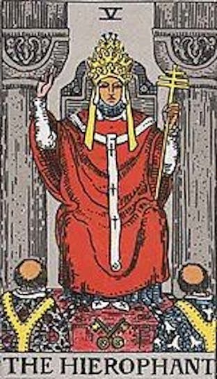 Ylipapin kortti on astrologisesti yhdistetty härän merkkiin. Ylipapilla on syvällinen merkitys henkisen tiedon, perinteiden ja auktoriteetin näkökulmasta. Ylipappi kuvataan usein istumassa valtaistuimella, pukeutuneena uskonnollisiin kaapuihin. Hän edustaa uskonnollista auktoriteettia, hengellistä opettajaa tai perinteen säilyttäjää. Kaksi pylvästä symboloivat kaksoisuutta ja vastakkaisten voimien tasapainoa – kuten laki ja armo, tai maallinen ja hengellinen. Kolminkertainen kruunu edustaa kolmea maailmaa: fyysinen, henkinen ja taivaallinen sekä myös mielen, kehon ja hengen ykseyttä. Ylipapilla on käsi ylhäällä siunauksessa (usein kaksi sormea osoittaa ylöspäin). Se symboloi siunausta ja opetuksen antamista sekä viittaa siihen, että tieto virtaa korkeammista lähteistä maalliseen maailmaan. Kulta- ja hopea-avainpari viittaa taivaan ja maan valtakunnan avaimiin sekä siihen, että Ylipappi voi avata salatun tiedon ovia. Kaksi oppilasta tai seuraajaa ovat polvillaan Ylipapin edessä. He kuvaavat oppimista, opetusta, ja oppipoika-mestari-suhdetta. Härkä on maa elementin merkki, joka liittyy turvallisuuteen, pysyvyyteen ja arvoihin. Ylipappi puolestaan edustaa perinteitä ja rakenteita. Yhdessä ne muodostavat erittäin vakaata, perinteisiin nojaavaa voimaa. Tämä yhdistelmä sanoo: "Luota siihen, mikä on kestänyt ajan koetuksen." Korttiin liittyy materiaalinen ja hengellinen tasapaino: Härkä nauttii maallisista iloista, kun taas Ylipappi edustaa hengellisiä arvoja. Tämä viittaa tarpeeseen löytää tasapaino henkisen ja fyysisen maailman välillä. Se korostaa hengellisyyden löytämistä arjen kauneudessa – esim. luonnossa, taiteessa tai rituaaleissa. Ylipappi tuo siihen vielä vahvan sitoutumisen perinteisiin tai vakaaseen järjestelmään – olipa kyseessä ihmissuhde, työ tai uskomusjärjestelmä. Tämä on energiaa, joka rakentaa hitaasti mutta pysyvästi. Ylipappi taas on opettaja ja mentori, joka ohjaa kohti syvempää viisautta. Se liittyy henkisen perustan rakentamiseen: käytännöllinen hengellisyys, rutiinien kautta syvenevä ymmärrys sekä arvojen tarkasteluun: mitä todella arvostat, ja ohjaavatko nuo arvot elämääsi?