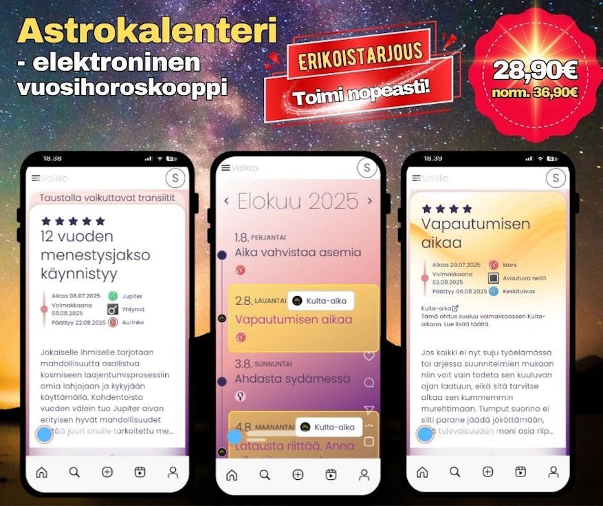 Astrokalenteri on tuonut selkeyttä ja rauhaa elämääni. Enää päätökset eivät tunnu sattumanvaraisilta." - Riikka, 38