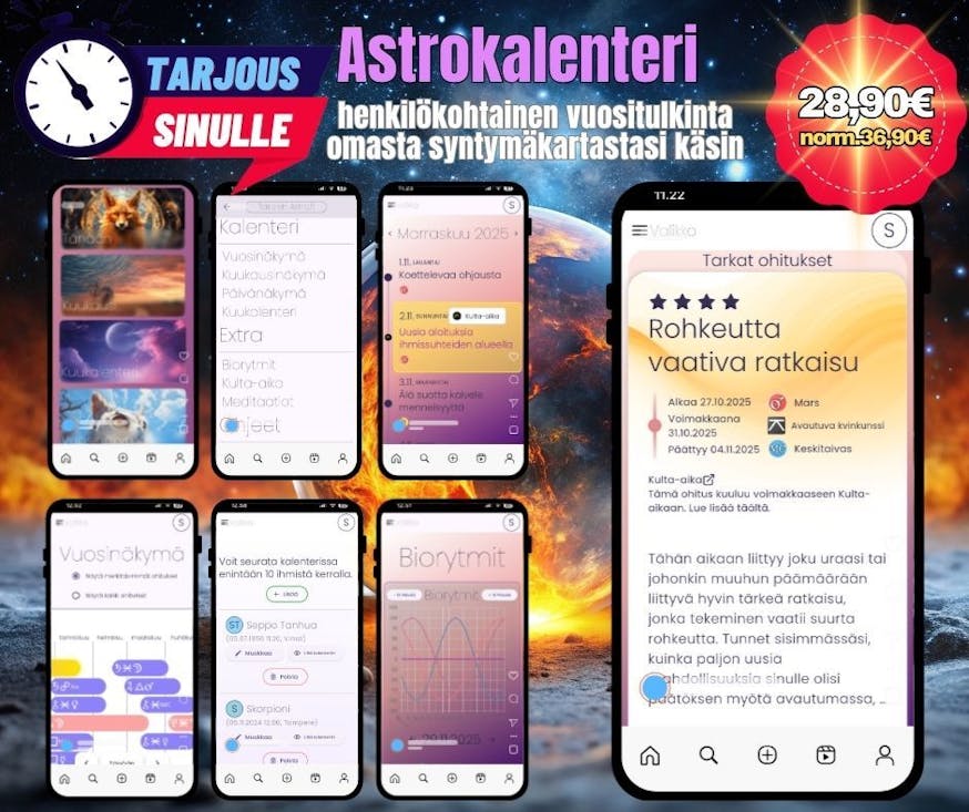Astrokalenteri on tuonut selkeyttä ja rauhaa elämääni. Enää päätökset eivät tunnu sattumanvaraisilta." - Riikka, 38