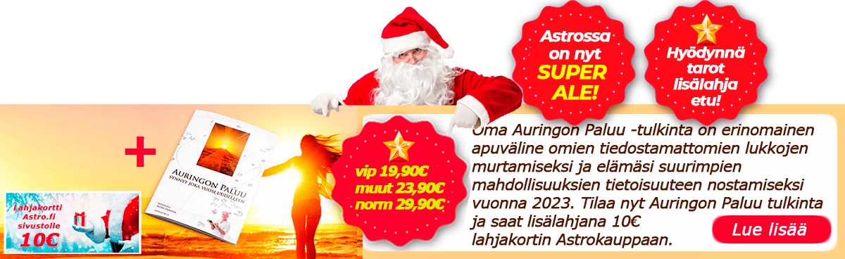 Mikä tahansa astrologista aikaa käsittelevä tulkinta kuten Astrokalenteri 12kk, Vuosi Elämääsi tai Auringon Paluu auttavat Sinua kasvamaan entistäkin vahvemmaksi henkisen polkusi kulkijaksi vuonna 2023. Siirry katsomaan huikeat joulutarjoukset lahjoineen tästä: